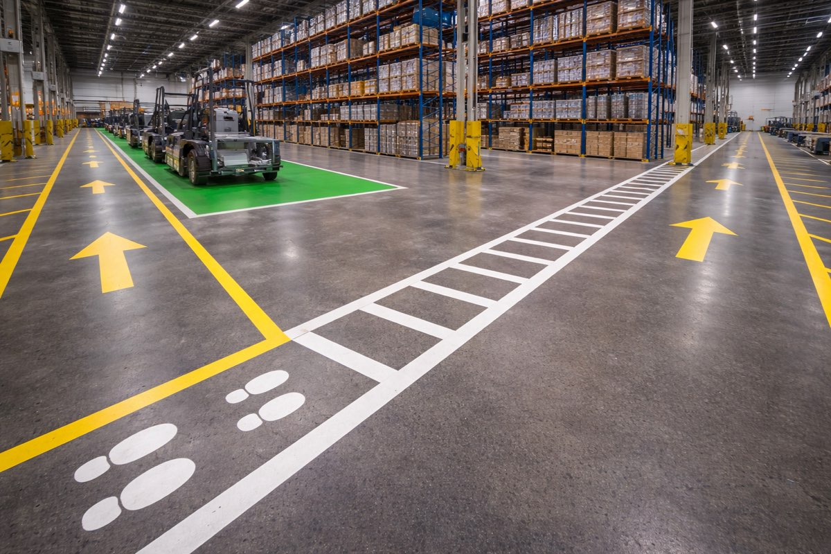 Professional industrial floor marking for warehouses, factories, and distribution centers. OSHA compliant safety lanes, pedestrian walkways, and equipment zones.